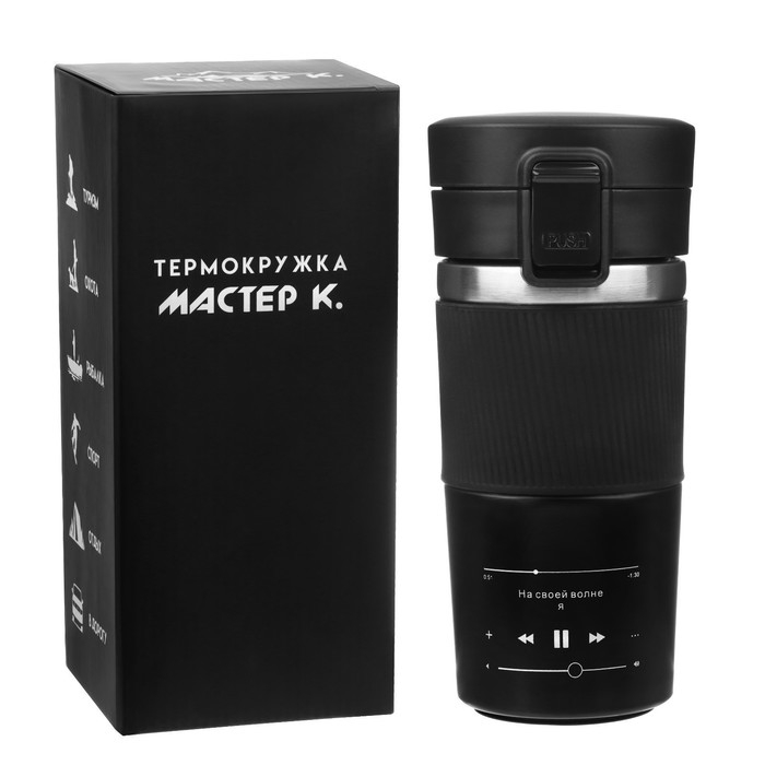 Термокружка для кофе и чая "Мастер К" идеальна для офиса, автомобиля, длительных прогулок и детям в школу. Благодаря специальному покрытию надежно лежит в руке.