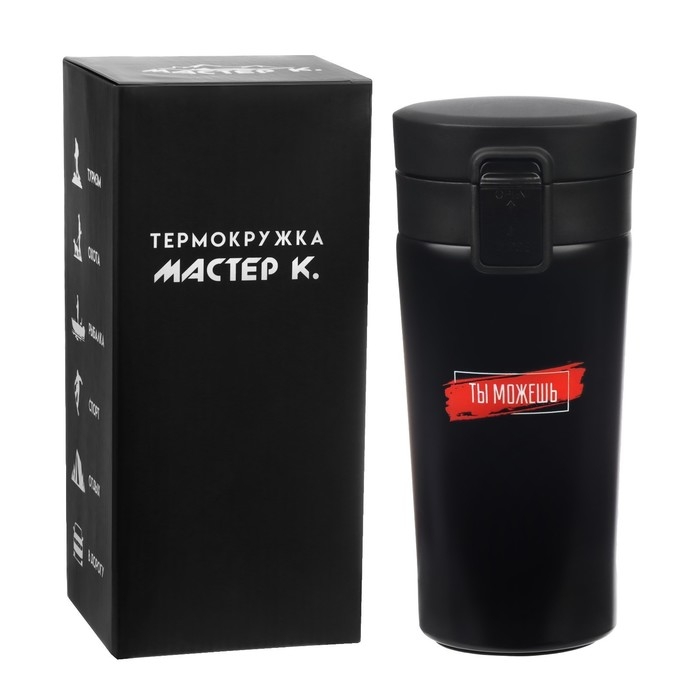 Термокружка для кофе и чая "Мастер К" идеальна для офиса, автомобиля, длительных прогулок и детям в школу. Благодаря специальному покрытию надежно лежит в руке.
