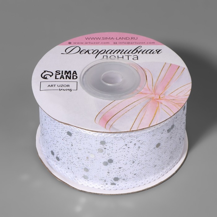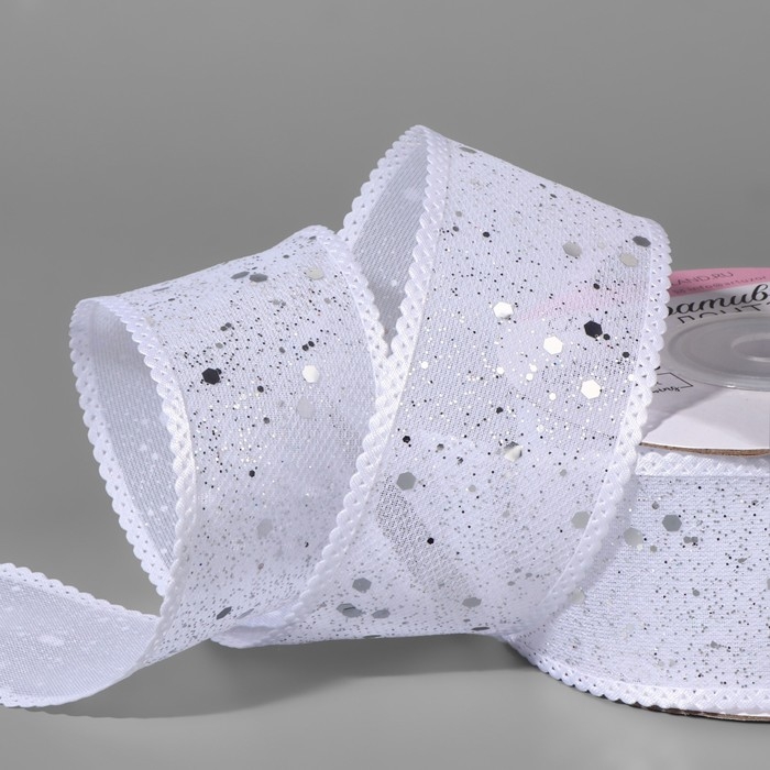 Лента декоративная, с глиттером, 38 мм, 9 ± 0,5 м, цвет белый/серебряный