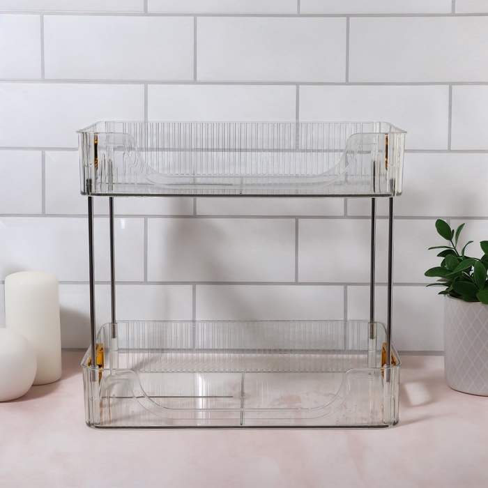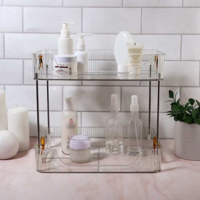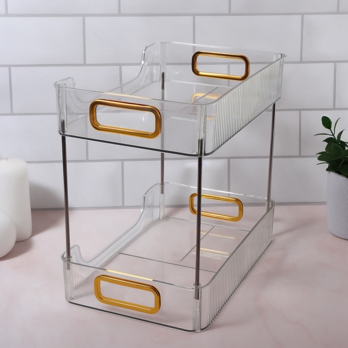 Благодаря современному минималистичному дизайну, органайзер станет гармоничным дополнением любого пространства. У органайзера два уровня, что значительно увеличивает место для хранения, а также у каждого уровня изделия есть ручки золотистого оттенка, что добавляет изящного вида.