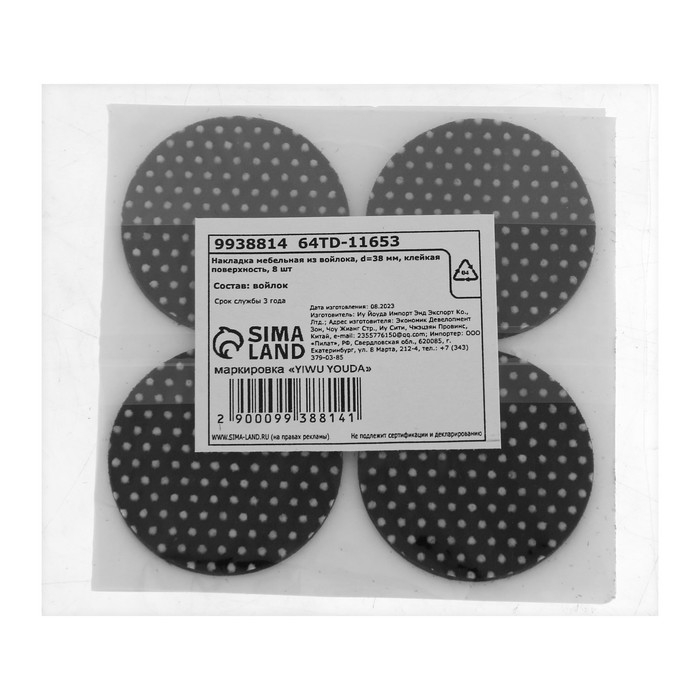 Накладка мебельная из войлока, d=38 мм, клейкая поверхность, 8 шт