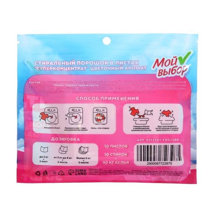 Упаковка содержит 30 листов, что обеспечит длительное использование. Стиральный порошок в листах "Мой выбор" - это надежный помощник в уходе за вашими вещами. Он обеспечивает чистоту и свежесть, а также сохраняет первоначальный вид и качество тканей.