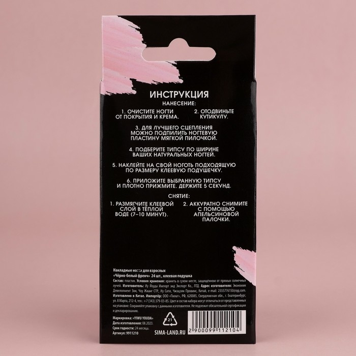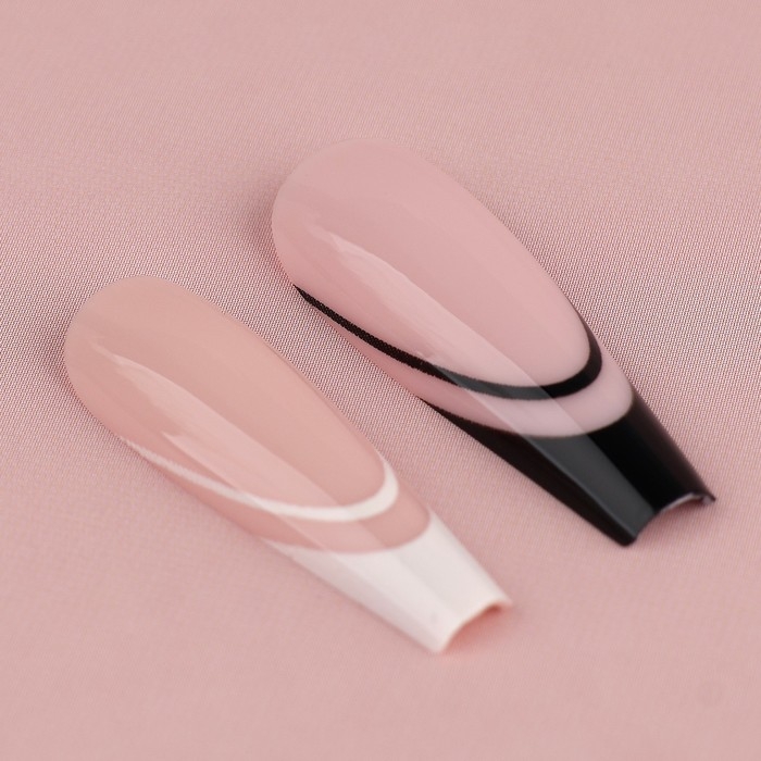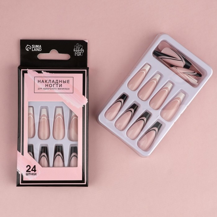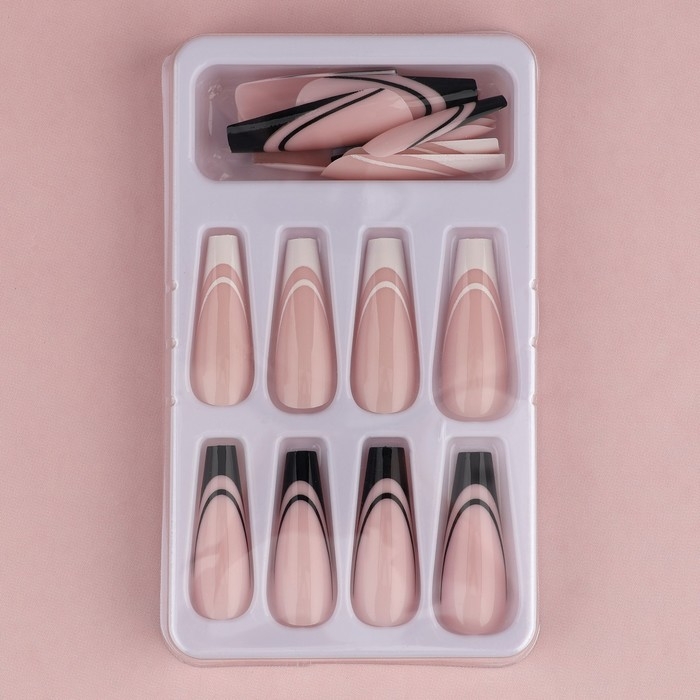 Накладные ногти для взрослых «Черно-белый френч», 24 шт, клеевые пластины, форма балерина, цвет глянцевый белый/чёрный/розовый