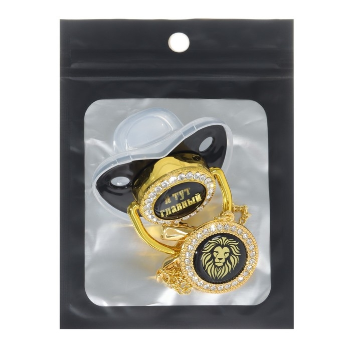 Соска - пустышка силиконовая ортодонтическая «Я тут главный», от 6 мес., с колпачком + держатель - цепочка, цвет черный/золото, стразы