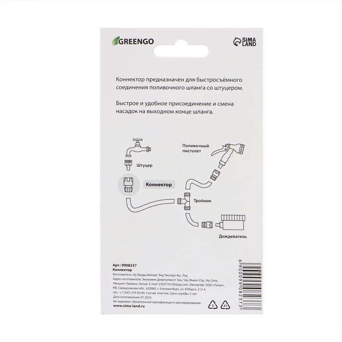 Коннектор предназначен для соединения шланга с пистолетами-разбрызгивателями и распылительными насадками. С ним вы сможете с легкостью менять насадки по необходимости.