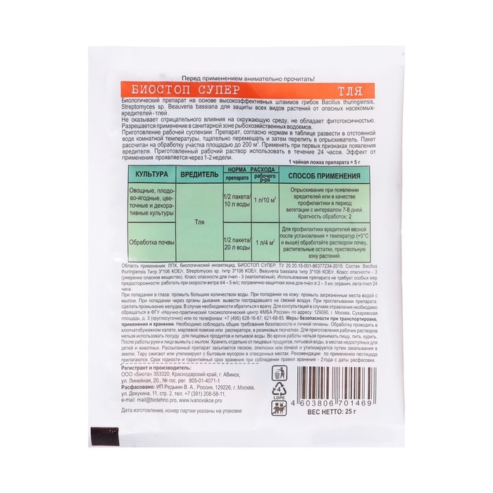 Средство инсектицидное от Тли "Биостоп супер", 25 г