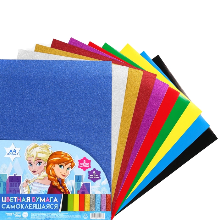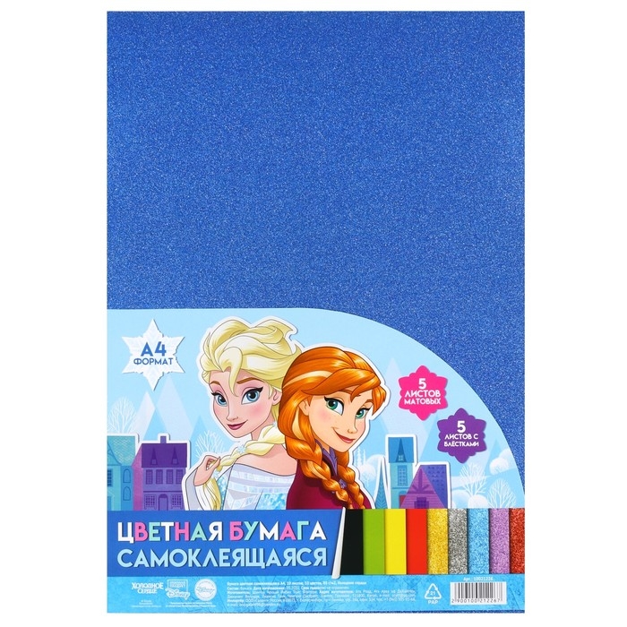 Бумага цветная самоклеящаяся, с блёстками, А4, 10 листов, 10 цветов, мелованная, односторонняя, в пакете, 80 г/м², Холодное сердце