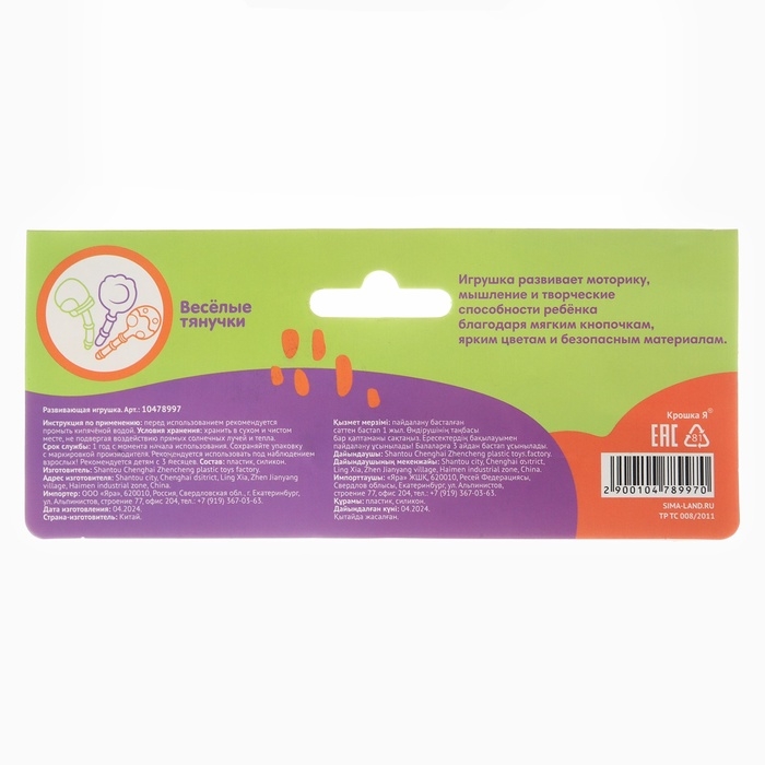 Развивающая сенсорная игрушка-погремушка «Малыш Дино» от Крошка Я предназначена для малышей от 3 месяцев. Она способствует развитию мелкой моторики, координации движений и цветового восприятия ребёнка.