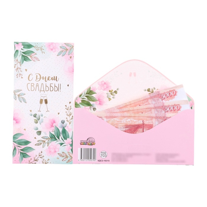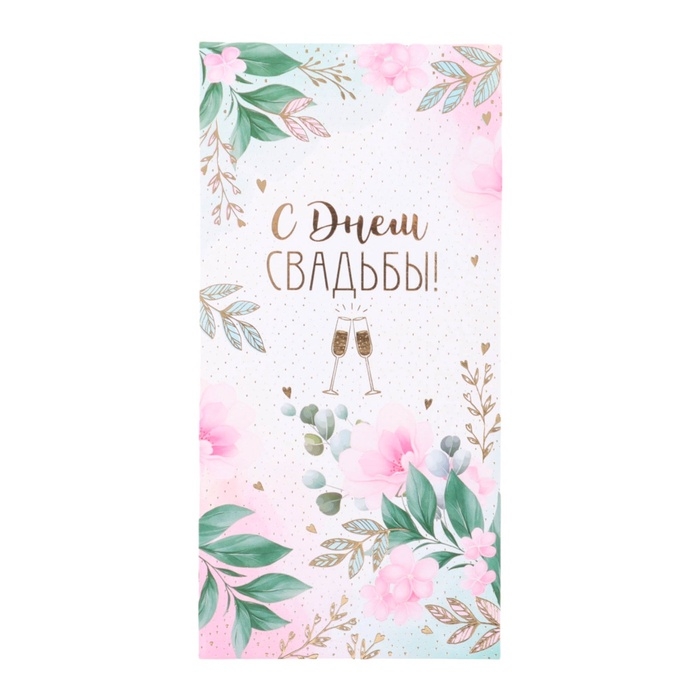 Конверт для денег "С Днём Свадьбы!" тиснение, бокалы, цветы, 8 х 17 см