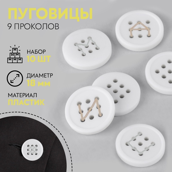 Набор пуговиц, 9 проколов, d = 18 мм, 10 шт, цвет белый