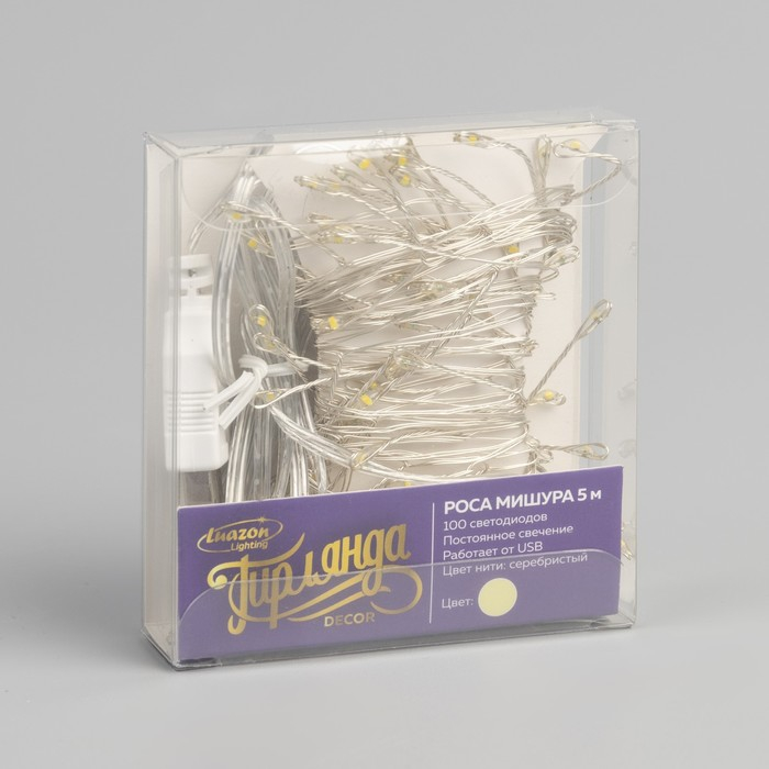 Гирлянда «Мишура» 5 м роса, IP20, серебристая нить, 100 LED, свечение тёплое белое, USB