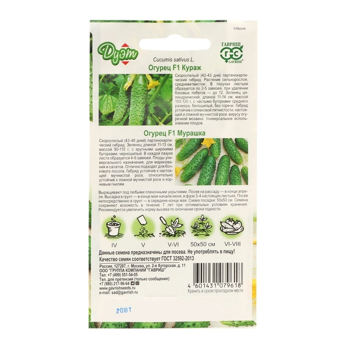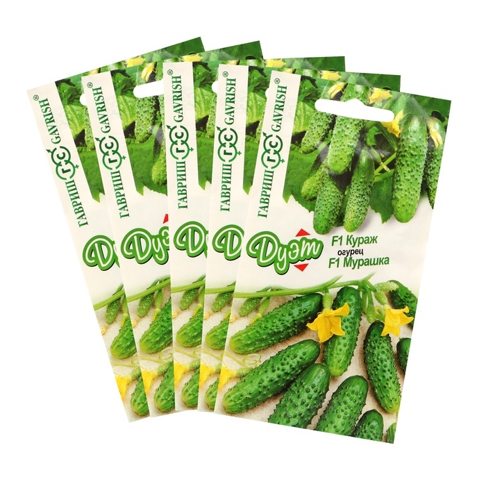 Семена огурцов "Кураж"Этот сорт огурцов гарантирует обильный урожай ароматных, хрустящих плодов насыщенно-зелёного цвета. Растение отличается повышенной устойчивостью к заболеваниям и неблагоприятным погодным условиям. Плоды "Кураж" имеют идеальную форму, бугорчатую текстуру и тонкую горьковатую кожицу, которая сохраняет свежесть и хрустящую консистенцию даже при длительном хранении. Огурцы "Кураж" прекрасно подходят как для свежего потребления, так и для консервирования. Их можно использовать в салатах, для заготовок на зиму, а также для фаршировки и приготовления различных блюд.Семена огурцов "Мурашка"Этот сорт поражает своей урожайностью и скороспелостью. Растение отличается компактными размерами и обильным плодоношением. Плоды "Мурашка" небольшого размера, тёмно-зелёного цвета с белыми полосками. Они идеально подходят для консервирования и малосольных заготовок. Огурцы "Мурашка" обладают насыщенным вкусом с лёгкой кислинкой и отменной хрустящей текстурой. Благодаря высокой устойчив