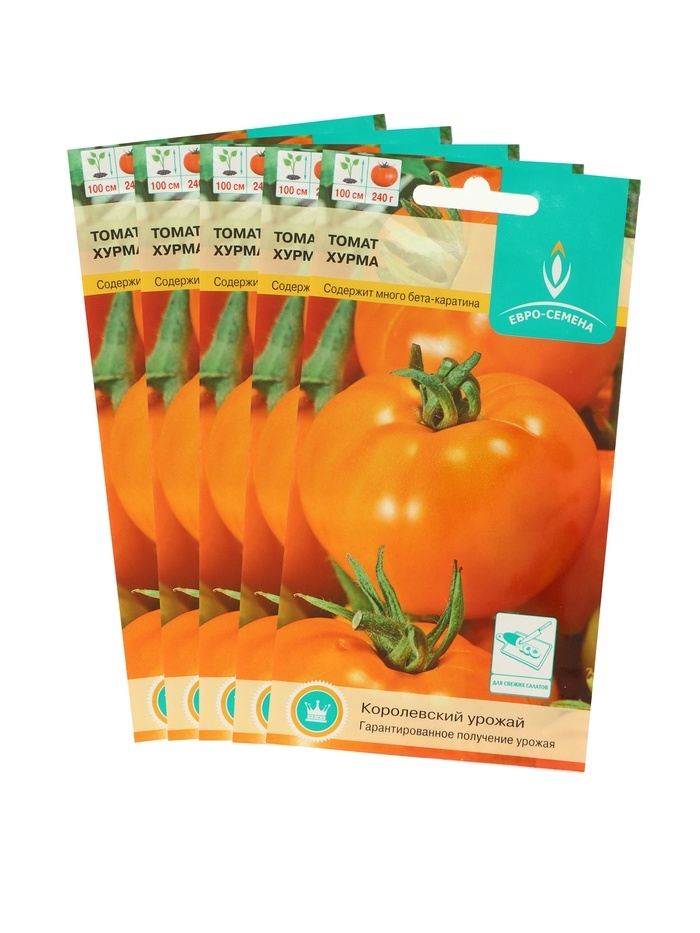Семена «Томат Хурма», низкорослый, 0,1 г — великолепный крупноплодный среднеспелый сорт. От всходов до начала плодоношения — 110–115 дней. Растение детерминантное, среднерослое. Первое соцветие закладывается над 7-м листом, последующие – через 1–2 листа. Плоды плоскоокруглые, слаборебристые, оранжевого цвета, массой 230–240 г и более. Вкусовые качества высокие. Сорт отличается крупноплодностью, высокой продуктивностью, повышенным содержанием бета-каротина, плоды не вызывают аллергические реакции организма. Посев: 20–30 марта. Высадка рассады: 1–10 июня. Схема высадки: 70 х 60 см. Уборка урожая: 25 июля — 10 сентября.