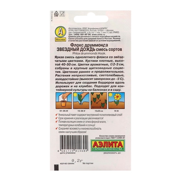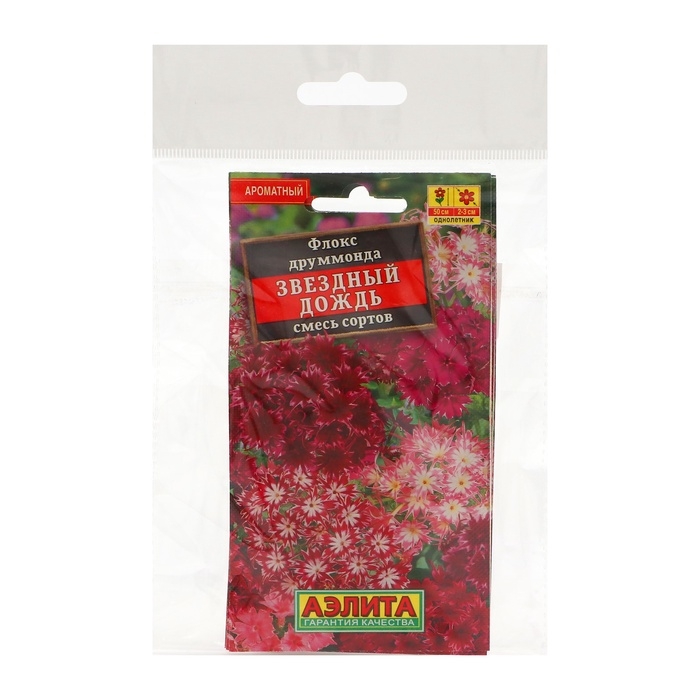 «Звёздный дождь» — это светолюбивое холодостойкое травянистое засухоустойчивое и долгоцветущее растение, которое подходит для украшения клумб, вазонов и каменистых горок. Приживается в увлажнённых питательных почвах на солнечных местах. В тени растёт плохо. Посев: в марте в горшочки для рассады. Всходы появляются через 5–7 дней. Пикируйте в фазе 1–2 настоящих листьев. Подкармливайте растущий флокс азотными удобрениями 2–3 раза с интервалом 7–10 дней. Перемещайте сеянцы в открытый грунт в мае на расстоянии 12–25 см друг от друга. Уход: поливайте в сухую и жаркую погоду. Регулярно удаляйте увядшие части. Подкармливайте комплексным минеральным удобрением каждые 10–14 дней. Цветение: с июня до заморозков. Высота: 50 см. Диаметр: 3 см.
