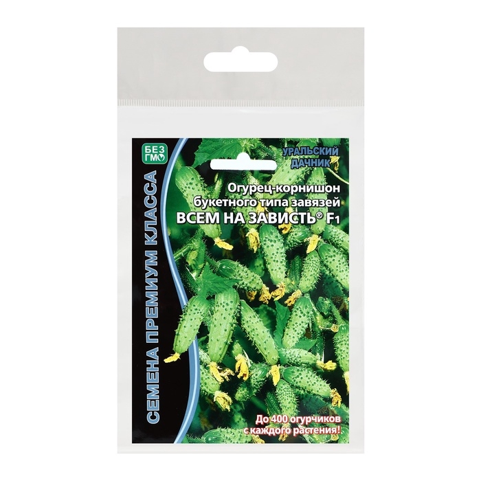 Партенокарпический скороспелый сорт «Всем на зависть» даёт стабильно высокий урожай благодаря устойчивости к болезням и неприхотливости к условиям среды. Хорошее отрастание боковых побегов обеспечивает длительное и активное плодоношение до наступления первых морозов. В узлах формируется 3–6 завязей. Яркие белошипые зеленцы длиной 9–12 см обладают прекрасными засолочными качествами. Большое преимущество гибрида — плодоношение в условиях нехватки света. Это позволяет выращивать огурцы в комнатных условиях. h2>Посев и уход h2>Высаживать нужно редко, не более 2 растений на 1 м². Также требуется обильный полив с подкормкой азотным удобрением.