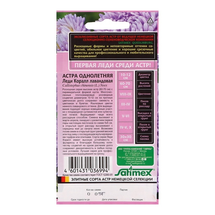 Семена цветов Астра "Леди Корал лавандовая", однолетняя, серия Эксклюзив, набор 5 шт