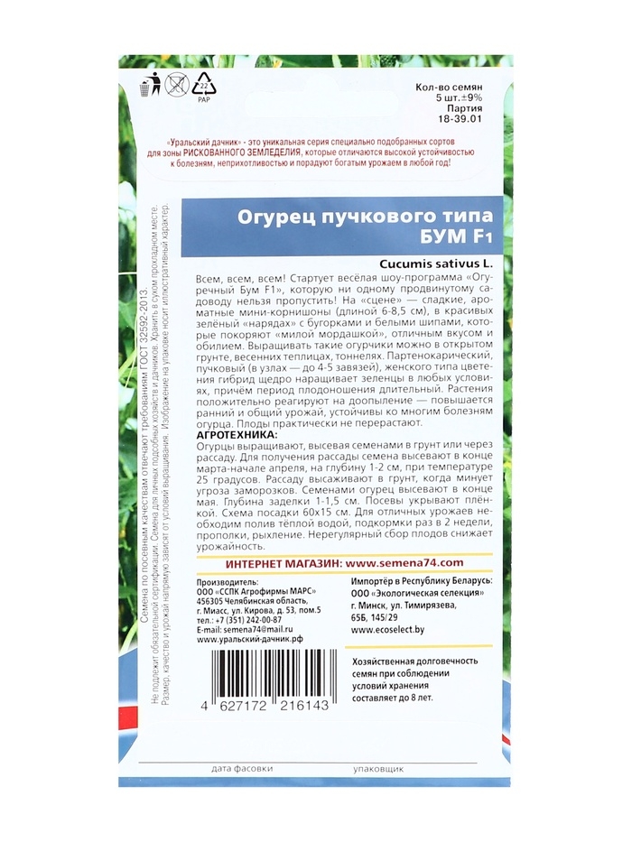 Семена огурца "Бум", F1, набор 5 шт