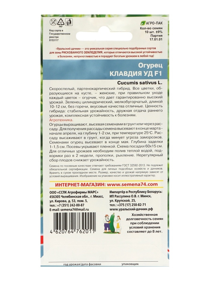 Скороспелый партенокарпический гибрид «Клавдия» даёт гарантированно высокий урожай. Цилиндрический бугорчатый зеленец длиной 10–12 см и массой 65–80 г имеет отличные вкусовые качества и не горчит. Ценность сорта: стабильная урожайность, дружная отдача, комплексная устойчивость к болезням. Посев: в грунт в конце мая при температуре почвы выше 13 °С и воздуха выше 15 °С. Плотность посадки — 3–4 растения на 1 м². Уход: своевременный полив и подкормка.