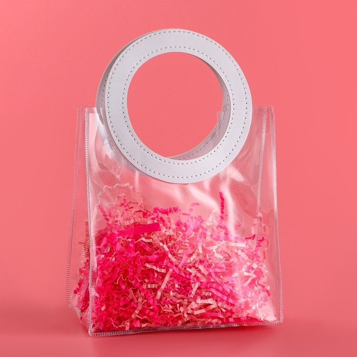 - Прозрачная сумочка с фигурной ручкой идеально подходит для различных видов подарков, начиная от косметики и заканчивая небольшими предметами интерьера.