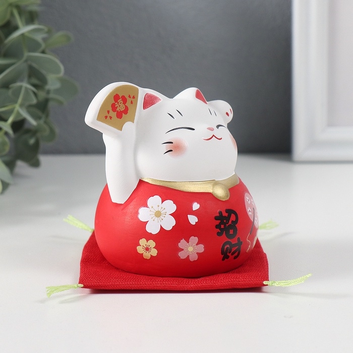Сувенир керамика "Кот Манэки-нэко с веером" красный 8х8х8,5 см