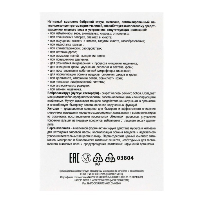 Бобровая струя (мускус, кастореум) – секрет железы речного бобра, обладает мощными лечебно-профилактическими, восстанавливающими и тонизирующими свойствами. Мускус оказывает мощное воздействие на нарушения в организме и способствует быстрому восстановлению нарушенных функций. В комплексе с хитозаном и пергой пчелиной бобровая струя способствует интенсивному снижению веса, повышению физической активности, омоложению организма, улучшению пищеварения и полному сжиганию жиров, поступающих с пищей. Хитозан – традиционное средство для быстрого и эффективного очищения кишечника, выведения «вредного холестерина», связывания и выведения жиров из организма, восстановления нормальных обменных процессов, улучшения усвоения кальция из пищевых продуктов, избавления от лишнего веса и целлюлита. Перга пчелиная – в нативной форме активизирует действие мускуса и хитозана для истощения жировой массы, нормализации обмена веществ и адекватного усвоения питательных веществ из пищи. Перга содержит ценный комплекс витаминов, минералов и биологически активных веществ, необходимый для гармоничного снижения веса и предупреждения возможных нарушений в организме. Нативный комплекс бобровой струи, хитозана, активизированный нативным концентратом перги пчелиной, способствует комплексному предотвращению лишнего веса и устранению сопутствующих изменений: