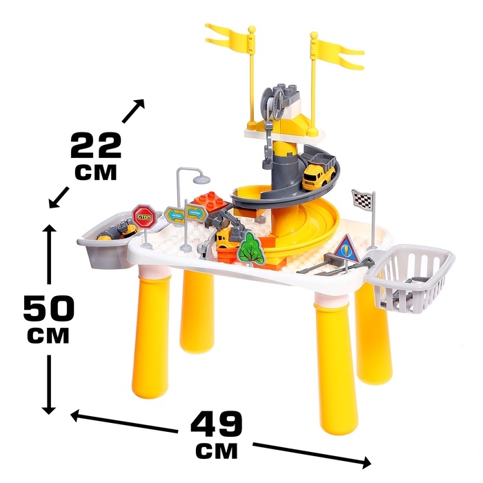 - 47 элементов, включая 4 яркие машинки с металлическими колёсами, детали для сборки стола и аксессуары с наклейками. В комплекте также прилагается подробная инструкция, которая шаг за шагом объяснит, как правильно собрать игровой стол.