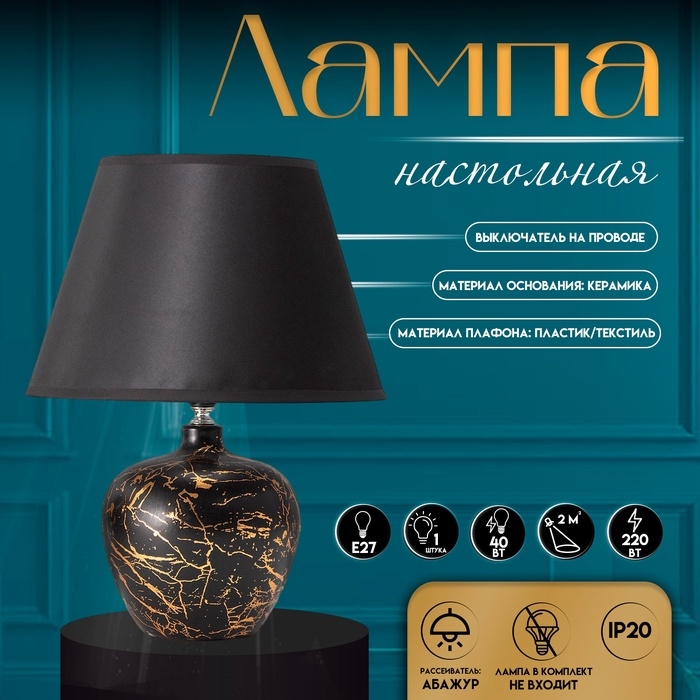 Настольная лампа с абажуром RISALUX «Сарин», Е27, 40 Вт, чёрно-золотой, 30×30×39.5 см