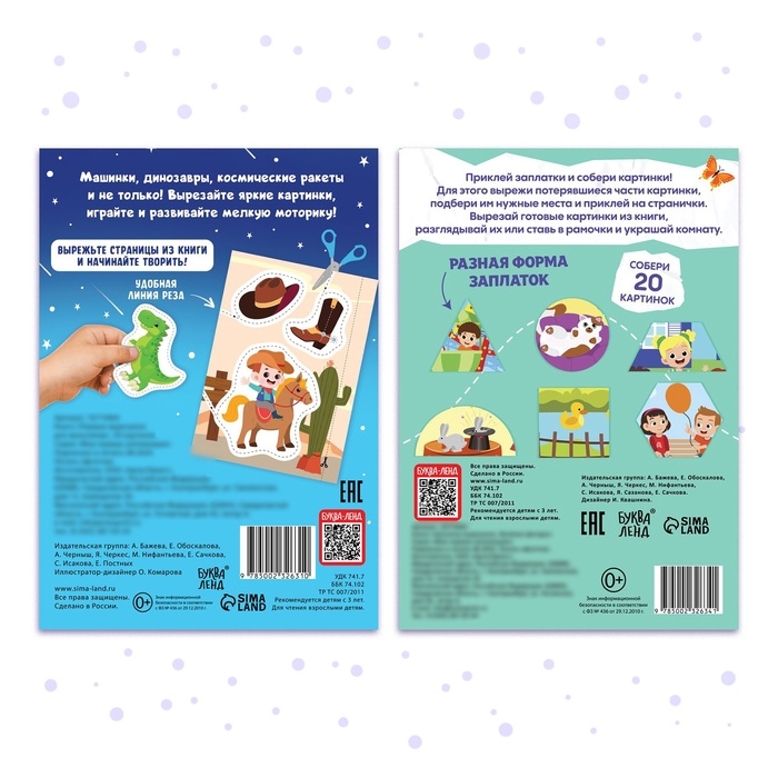 - Книга станет хорошей основой для совместного времяпрепровождения с ребёнком. Вы можете вырезать картинки вместе, обсуждать детали и цвета, а затем создать из них целую коллекцию оригинальных аппликаций. Это не только полезно, но и весело!