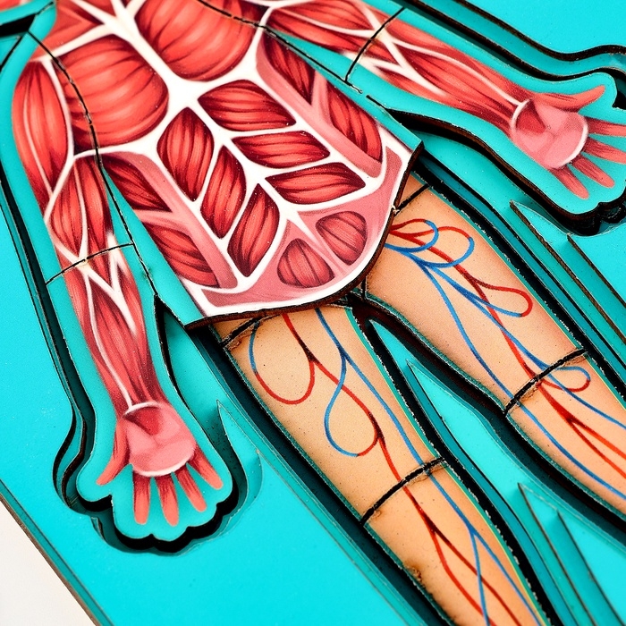 - Организм человека показан в 5-ти слоях: скелет, кровеносная система, мышечная система, внутренние органы и кожа.