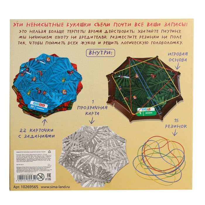 Настольная игра «Логические жуки» — это увлекательная головоломка для юных игроков. Задача ребёнка — разместить резинки на поле, решая задания на логику и внимательность.