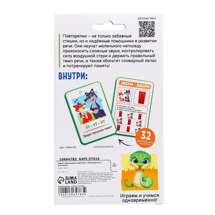 «Повторялки и омонимы» — обучающие карточки, созданные для увлекательного и полезного времяпрепровождения детей от 3 лет. Это не просто игра, а целый процесс познания, который помогает развивать воображение и речь. Карточки станут отличным выбором для родителей, которые хотят внести разнообразие в занятия с ребёнком.