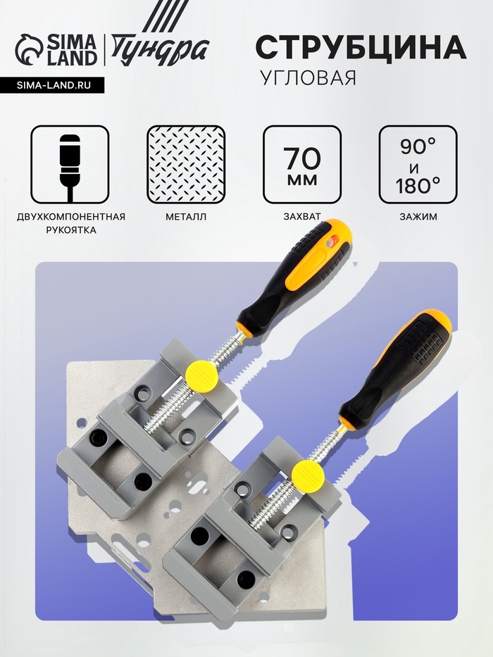 Струбцина угловая усиленная ТУНДРА, металлическая, два зажима 90 и 180°, 2К рукоятка, 70 мм 107021