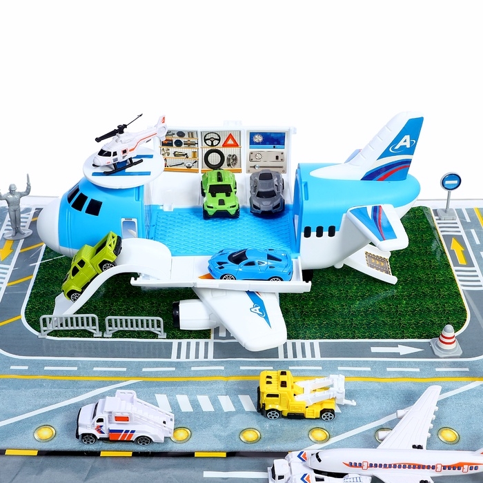 - Самолёт-парковка: яркий и вместительный, он открывается и превращается в игровую зону с гаражом, удобным въездом для машинок, быстрым спуском и вертолётной площадкой.