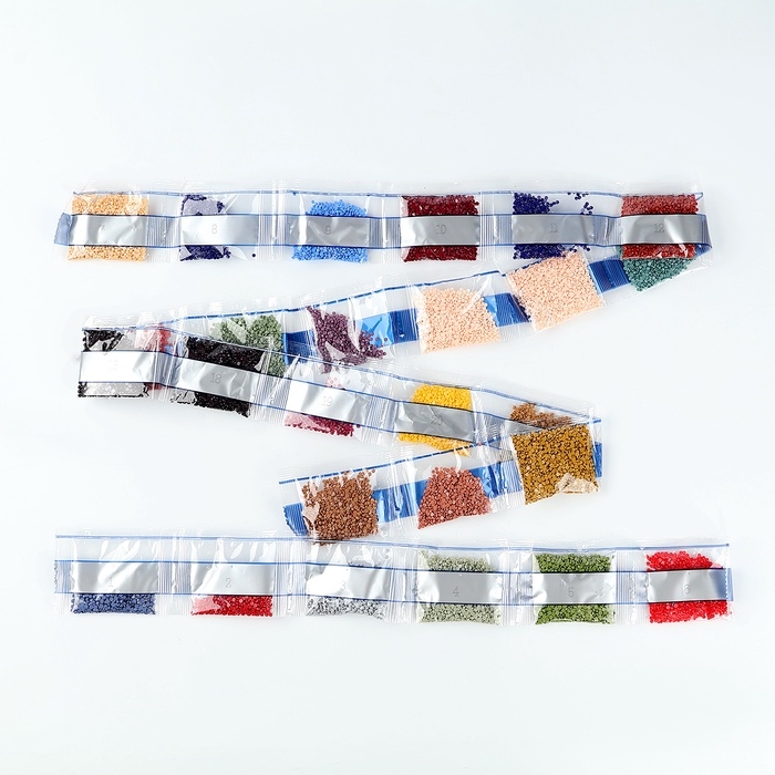 - Из пакетика с номером, который соответствует схеме, отсыпьте в ёмкость немного страз.