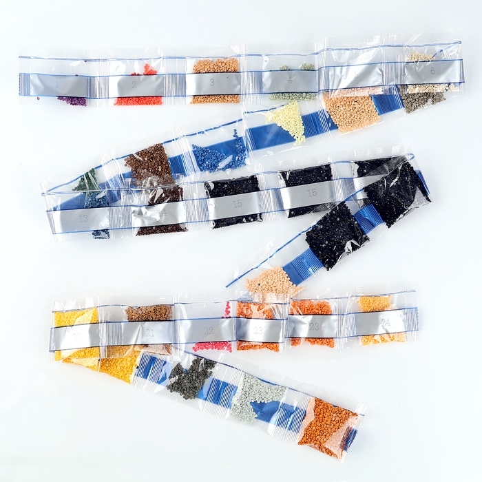Вам предстоит разложить кристаллики карандашом по пронумерованной схеме. Холст с клеевым покрытием будет надёжно удерживать стразы.