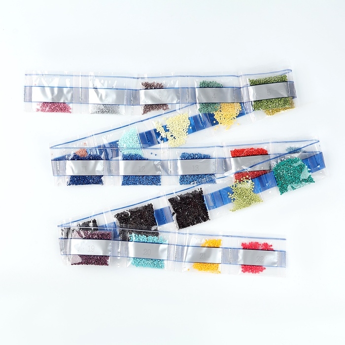Вам предстоит разложить кристаллики карандашом по пронумерованной схеме. Холст с клеевым покрытием будет надёжно удерживать стразы.
