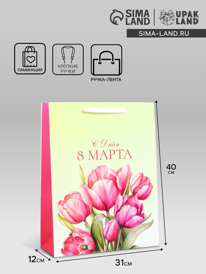 Пакет подарочный ламинированный вертикальный «С 8 Марта», L 31 × 40 × 12 см