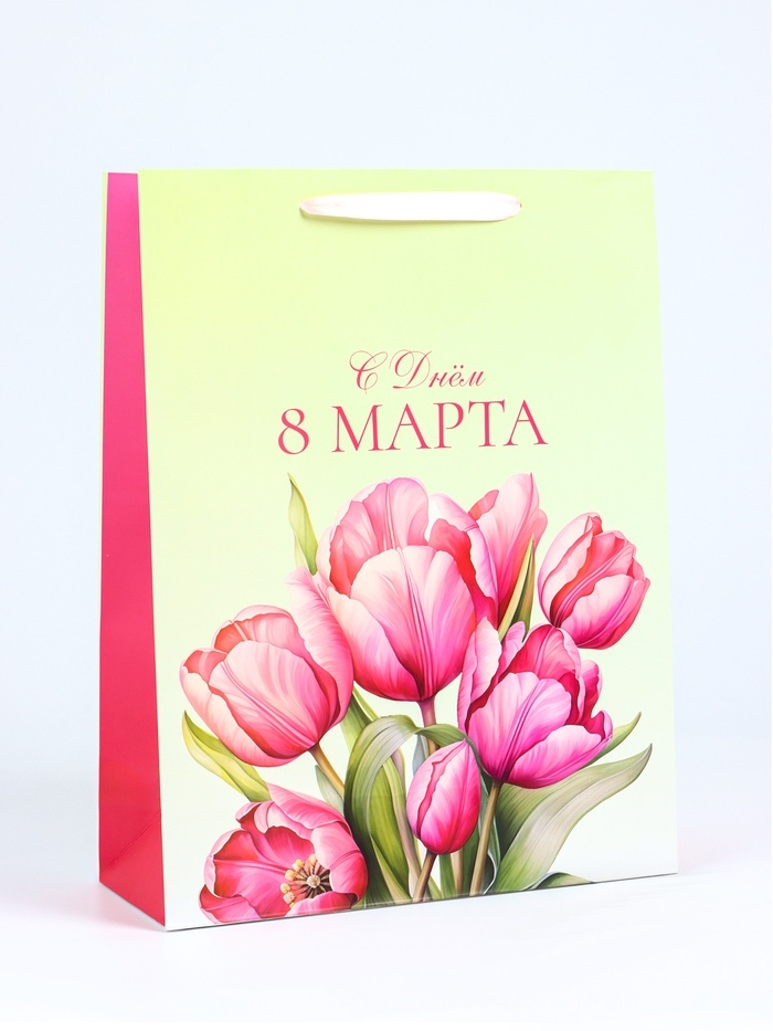 Этот яркий и праздничный подарочный пакет станет идеальным выбором для поздравления девушки на 8 Марта! Вертикальный формат пакета позволяет удобно разместить различные виды подарков, такие как косметика, украшения или книги.