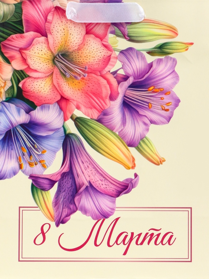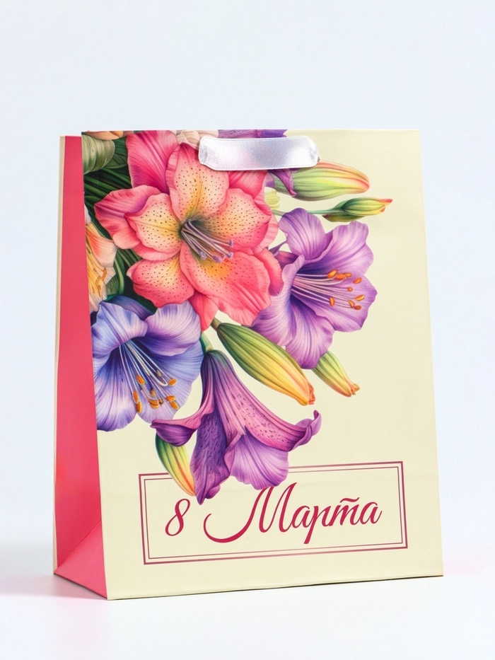 Этот яркий и праздничный подарочный пакет станет идеальным выбором для поздравления девушки на 8 Марта! Вертикальный формат пакета позволяет удобно разместить различные виды подарков, такие как косметика, украшения или книги.