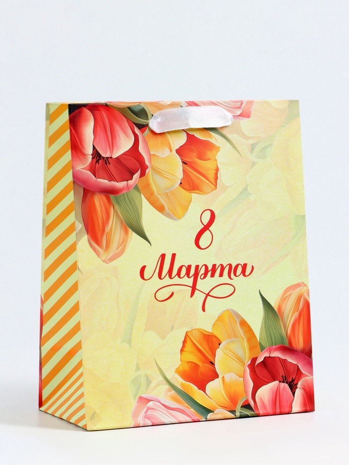 Этот яркий и праздничный подарочный пакет станет идеальным выбором для поздравления девушки на 8 Марта! Вертикальный формат пакета позволяет удобно разместить различные виды подарков, такие как косметика, украшения или книги.