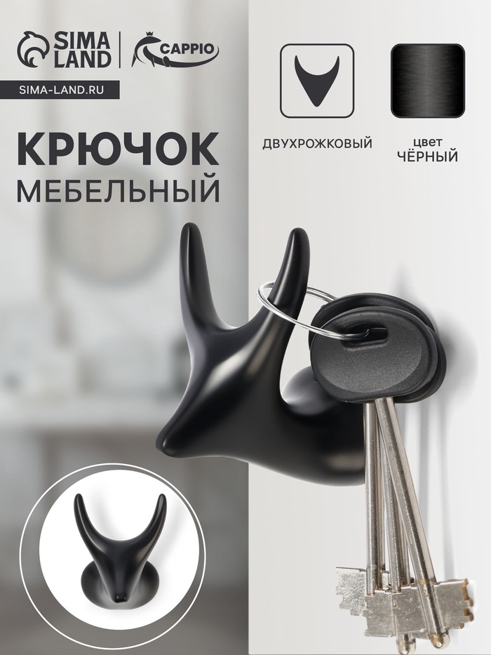 Крючок мебельный CAPPIO BAMBI, двухрожковый, цинк, цвет чёрный