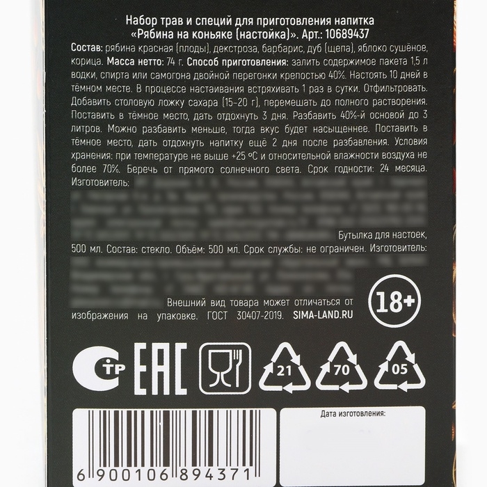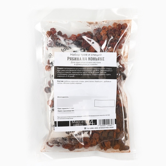 Подарочный набор для приготовления настойки «Рябина на коньяке», набор трав и специй 20 г., бутылка 500 мл., инструкция