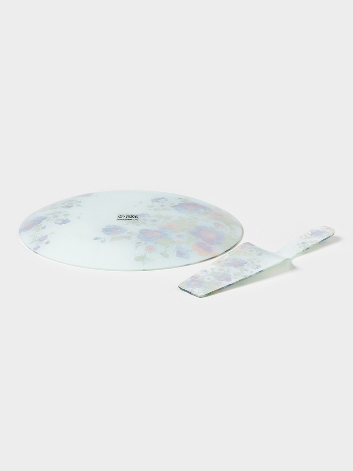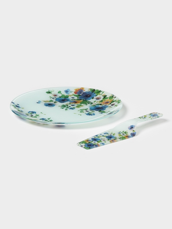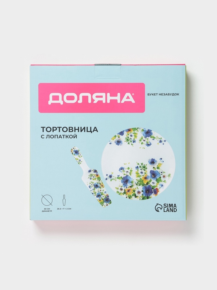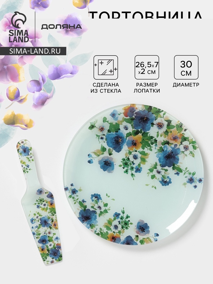 Тортовница с лопаткой Доляна «Букет незабудок», 2 предмета: блюдо d=30 см, лопатка 26,5×7×2 см, стекло, рисунок