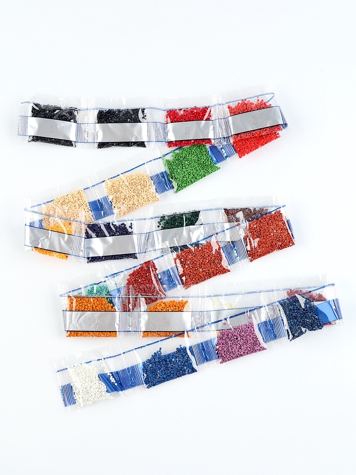 - Из пакетика с номером, который соответствует схеме, отсыпьте в ёмкость немного страз.