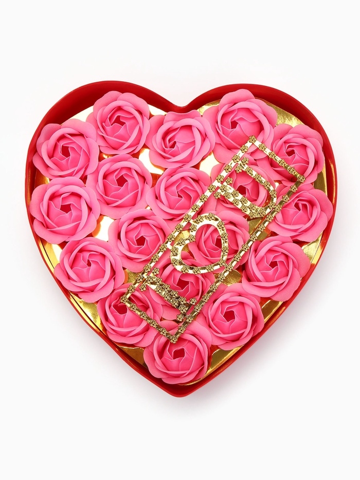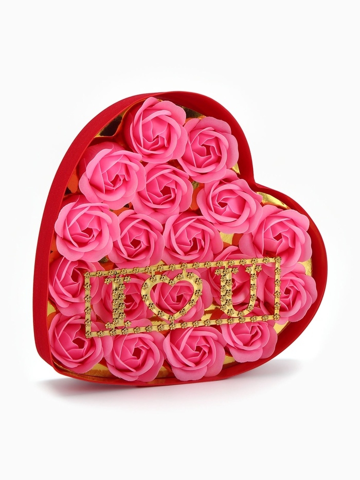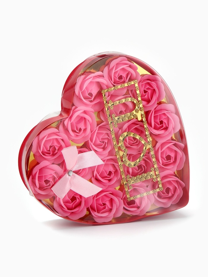 18 мыльных розовых роз с надписью в коробке