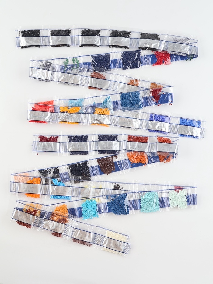 - Из пакетика с номером, который соответствует схеме, отсыпьте в ёмкость немного страз.