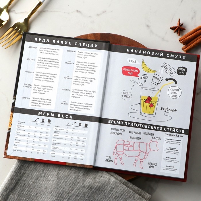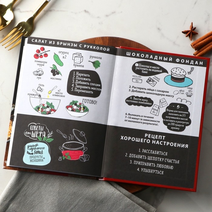Ежедневник для записи рецептов - Отличный помощник на кухне, он всегда будет под рукой, в отличие от любых электронных аналогов. Записи позволят не забыть про удачный рецепт, который снова захотите повторить. Для удобства использования, вы можете отмечать сложность, время приготовления, где готовится и количество порций, для каждого рецепта, а так же записывать весь процесс приготовления. Благодаря твердой обложке он прослужит долгие годы. А универсальный формат, не займет много места на вашей кухне.