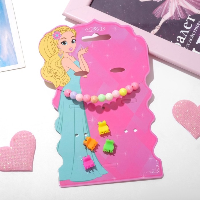 Комплект детский «Выбражулька» 5 предметов: 2 резинки, бусы, браслет, кольцо, цветочек, цвет розовый