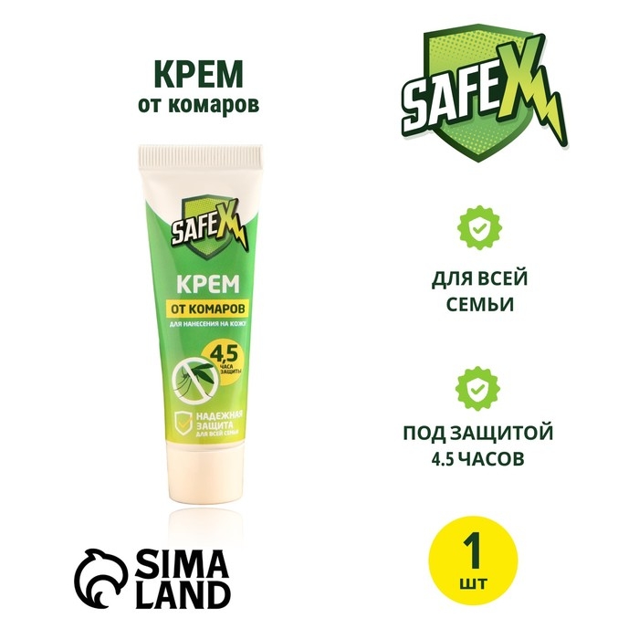 Крем от комаров SAFEX наноситься тонким слоем (без втирания) на открытые участки тела. Применение: тонким слоем без втирания нанести гель на открытые участки тела (лицо, шею, руки, ноги). При необходимости нанести повторно. Избегать попадания в рот, глаза и на поврежденные участки кожи. При попадании в глаза, промыть водой, при попадании в рот прополоскать.Хранить отдельно от пищевых продуктов, в местах, недоступных детям. Не рекомендуется применять детям.Состав: пп-диэтилтолуамид 25 %, структурообразователи, отдушка, вода.