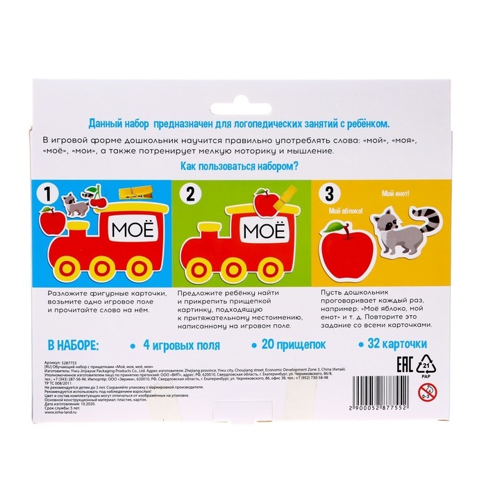 В обучающий набор «Мой, моя, моё, мои» входят 32 карточки и 20 прищепок. Игра рекомендована детям старше 3 лет.